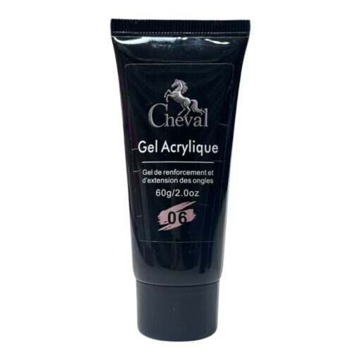 Gel acrylique professionnel Cheval, idéal pour le renforcement et l’extension des ongles. Texture facile à travailler, haute résistance et finition naturelle. Tube pratique 60g – teinte 06.