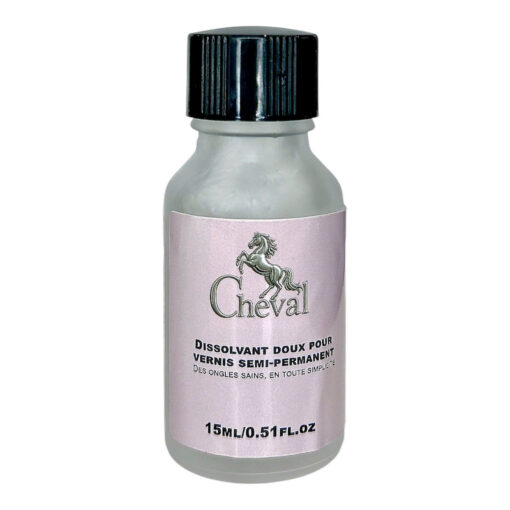 Dissolvant doux Cheval 15ml pour vernis semi-permanent. Élimine efficacement sans abîmer les ongles. Idéal pour une dépose propre et rapide.